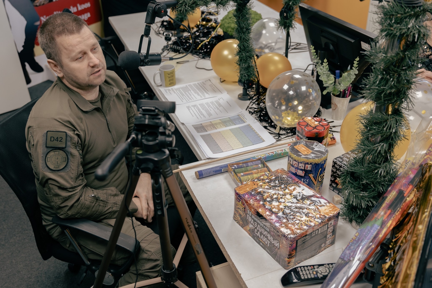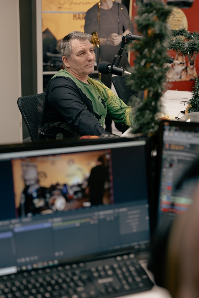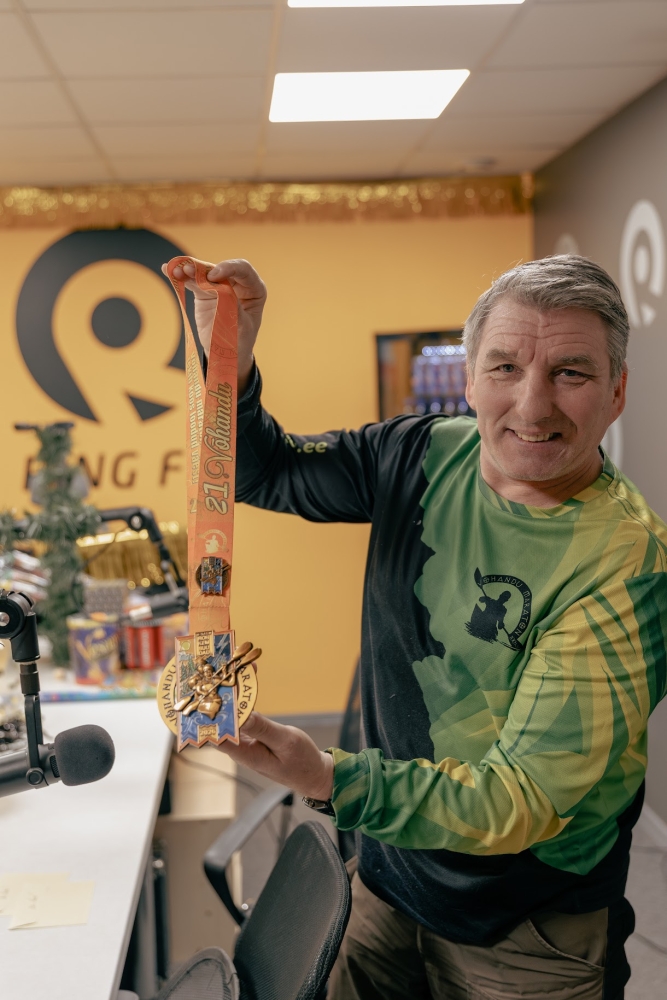 Võhandu maratoni peakorraldaja Hillar Irves 31. detsembril Ring FMi stuudios näitamas 2026. aasta maratoni medalit ja rääkimas medali kujundamise telgitagustest. Fotod: AIGAR NAGEL
