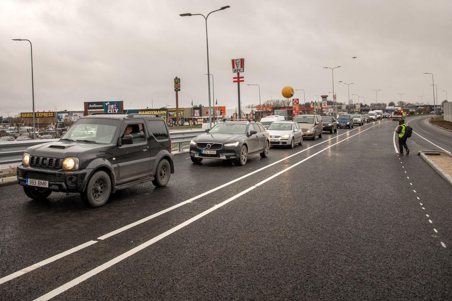 MITMEL TASANDIL RINGRISTMIK > Täna keskpäeval ergastas sombust ja kerget lund sadavat ilma erksates helkurvestides seltskond, kes kogunes Tartu Riia ringi viadukti ja ringristmiku lähistele Tuvi tänava parklasse. Kell 13.24 sõitis esimene auto üle vastse viadukti.