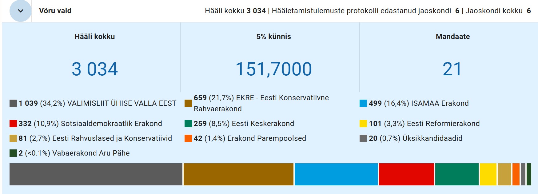 Võru vallas võitis kohaliku volikogu valimised Valimisliit Ühtse Valla Eesti.