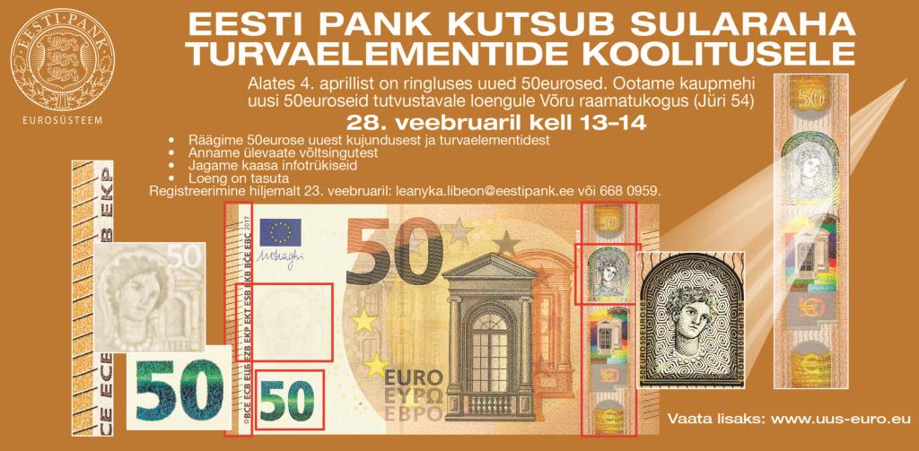 Uute turvaelementidega 50eurone jõuab ringlusse alates 4. aprillist. Esimene koolitus toimub Võru raamatukogus 28. veebruaril.