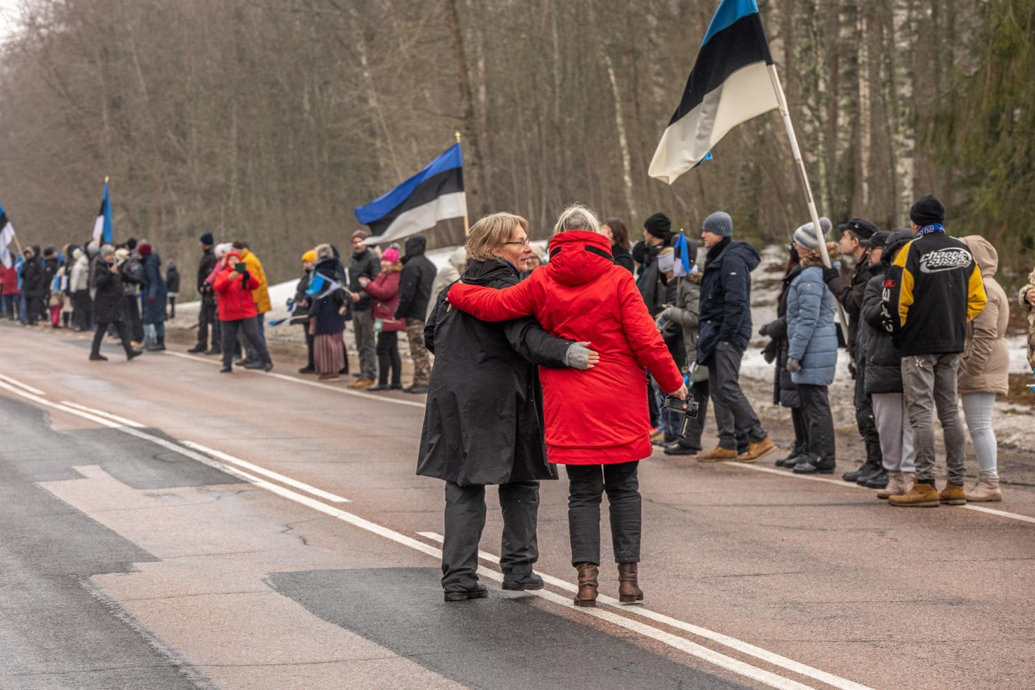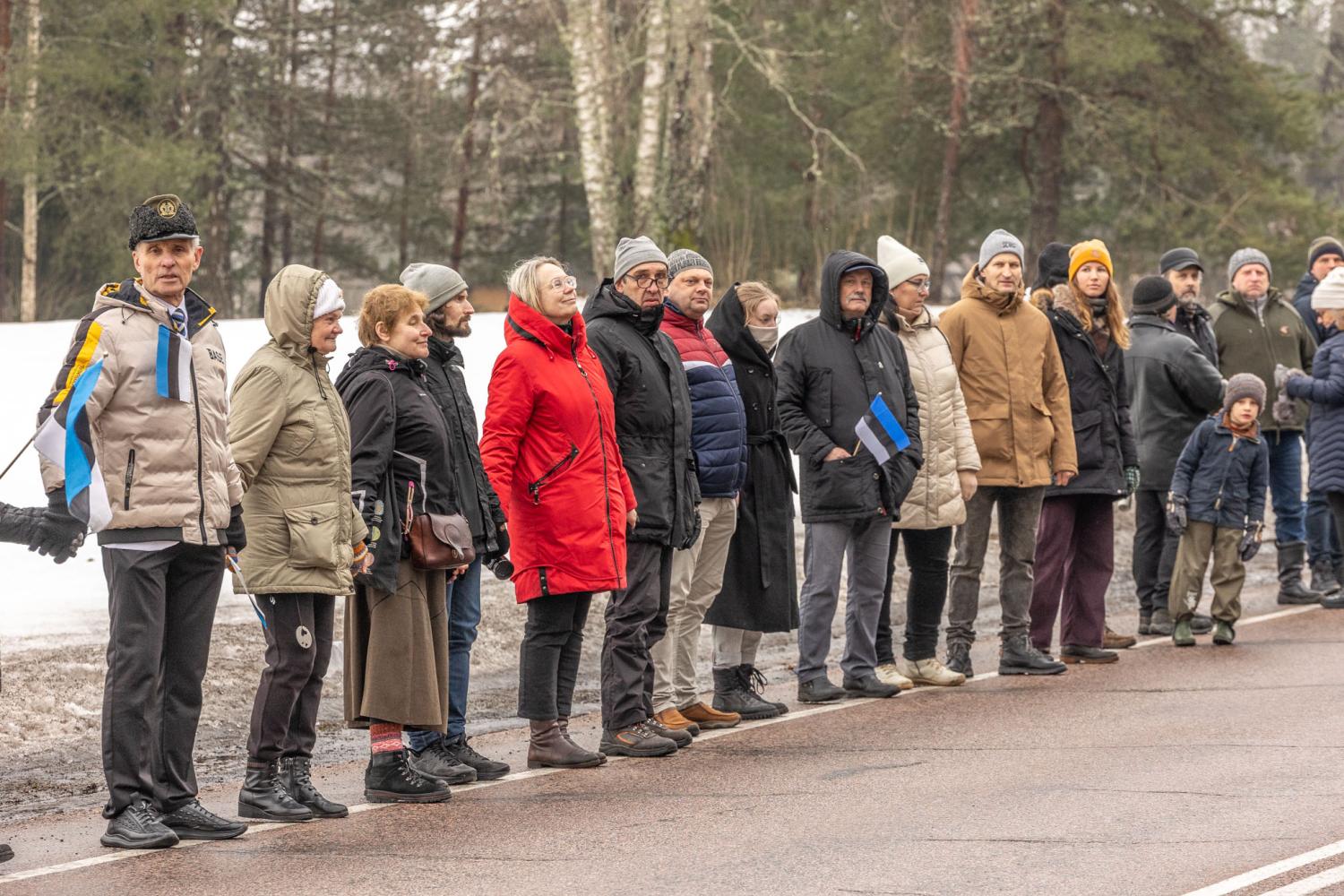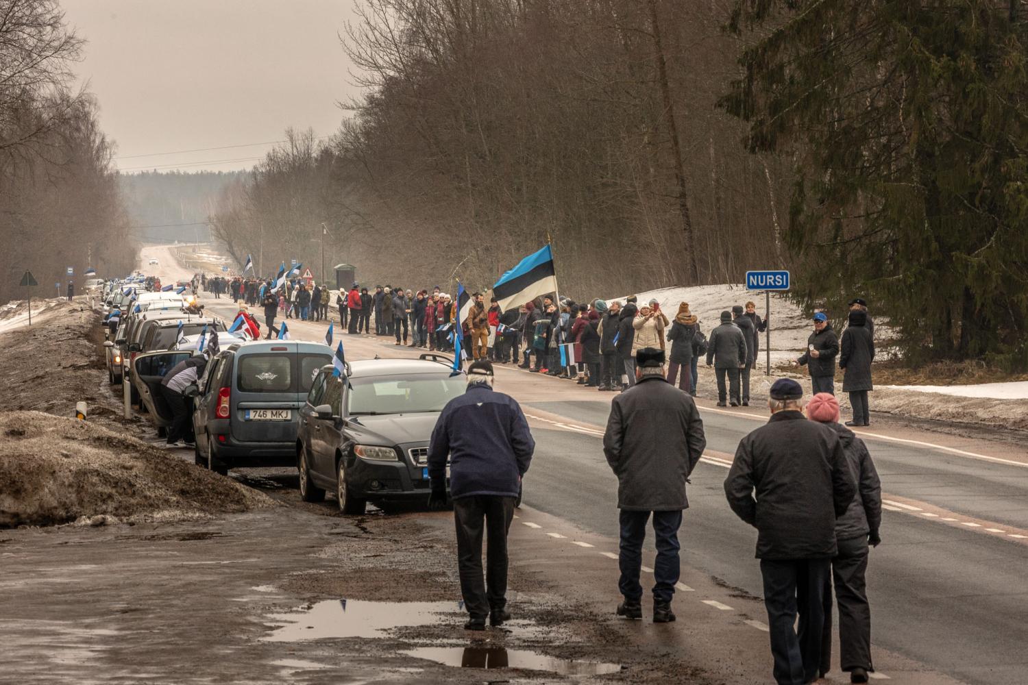 Kella poole kahest kogunes Tallinna-Võru maanteele märkimisväärne autokolonn, mis ohutulede vilkudes ja sõidukite külge kinnitatud sini-must-valgete lippude lehvides sõitis läbi kesklinna Nursi poole. Tänavu oli osavõtjate arv suurem kui möödunud korral ning Nurssi jõudes väljuti autodest ja ühendati hetkeks käed, et moodustada inimkett. Kohale oli tulnud rahvast nii Põlvamaalt kui ka Soomest. Võrumaalane Peep Kesler tõi ketis seistes näiteks, et opositsioonil on käest võetud vahendid ning sellise valitsusega tema sõnul jätkata ei saa. Pärnus elav ja Soomes töötav Tiina Vinter avaldas pahameelt, et praegune valitsus on jätnud maapiirkonnad hooletusse ja ei soosi väiksemates paikades elamist. “Elu on läinud aina hullemaks. Kõik hinnad tõusevad, koolid, lasteaiad ja kauplused suletakse,” tõi Vinter välja. Enno Pilbergi sõnul oli seltskond tulnud toetusavaldusele Eesti Leegioni sõprade Lõuna-Eesti maleva nimel ja rahul ei olda valitsuse üldise käitumisega. “Käisime ka suvel kui meeleavaldus toimus Tamula ääres. Eelmine aasta Nursis ei käinud, kuid asjad on läinud aina hullemaks ja oma arvamust tuleb nähtavaks teha,” kinnitas Enno Pilberg. Ta osutas oma tee pervel seisvale sõidukile, mida ühest küljest kaunistas Eesti Leegioni sõprade lipp ja teiselt Eesti lipp. “Ma panin vahepeal ka Ukraina lipu lehvima, kuid täna on tunne, et oma rahvalt võetakse kõik ära, et võõraid aidata. Ma saan aru, et aitama küll peab, aga kuskilt läheb ka mõistlikkuse piir,” tõi Pilberg välja.